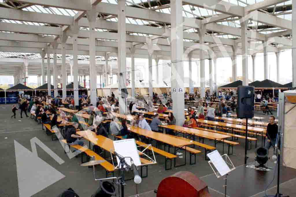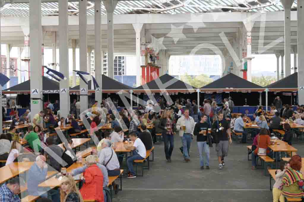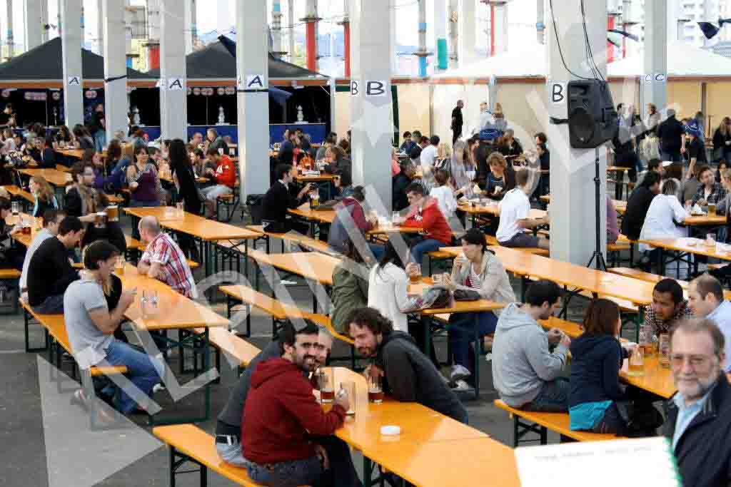 Montaje para la fiesta de la cerveza de Barcelona, con más de un centenar de mesas plegables y 200 bancos plegables, que mientras, duró la Oktoberfest, sentó a la vez a mil personas. Una fiesta de la cerveza de Barcelona fantástica, con un éxito total de gente que disfrutó, sentados en nuestras mesas y bancos, de la buena cerveza, así como de la comida, música y la compañía en esta celebración.