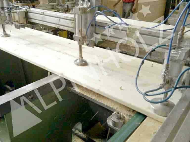 El mecanizado Alpinholz de la madera se inicia siempre en su sentido longitudinal. Y supone el regruesado a 25mm de todas las piezas (banco y mesas) y el pulido de las cuatro caras. A la vez que se realizan los encastes para la posterior colocación de los herrajes.