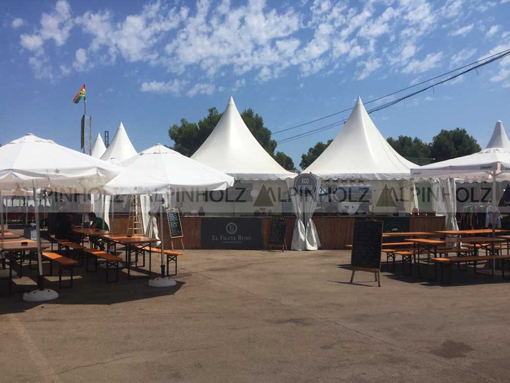 Estas mesas y bancos plegables de madera, las usamos en este festival de música, en el punto de restauración asignado a nuestro cliente. En total 10 sets Alpinholz, para sentar unas 80 personas a la vez. Estas pudieron descansar y reponer fuerzas, después de conciertos y espectáculos.